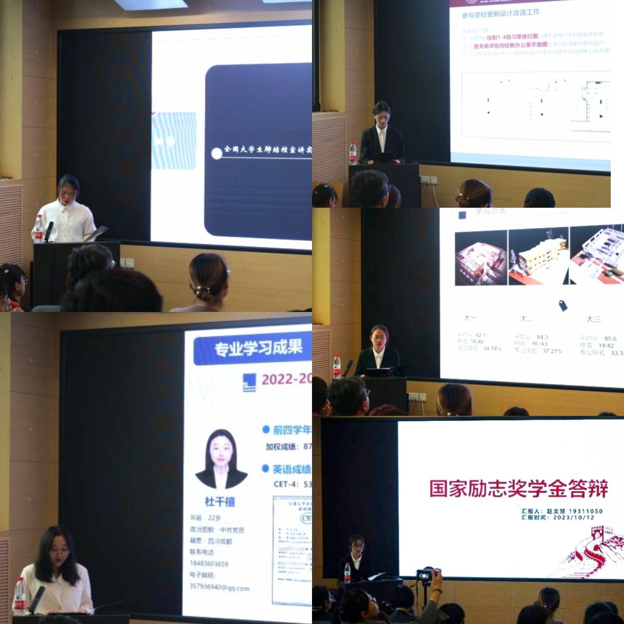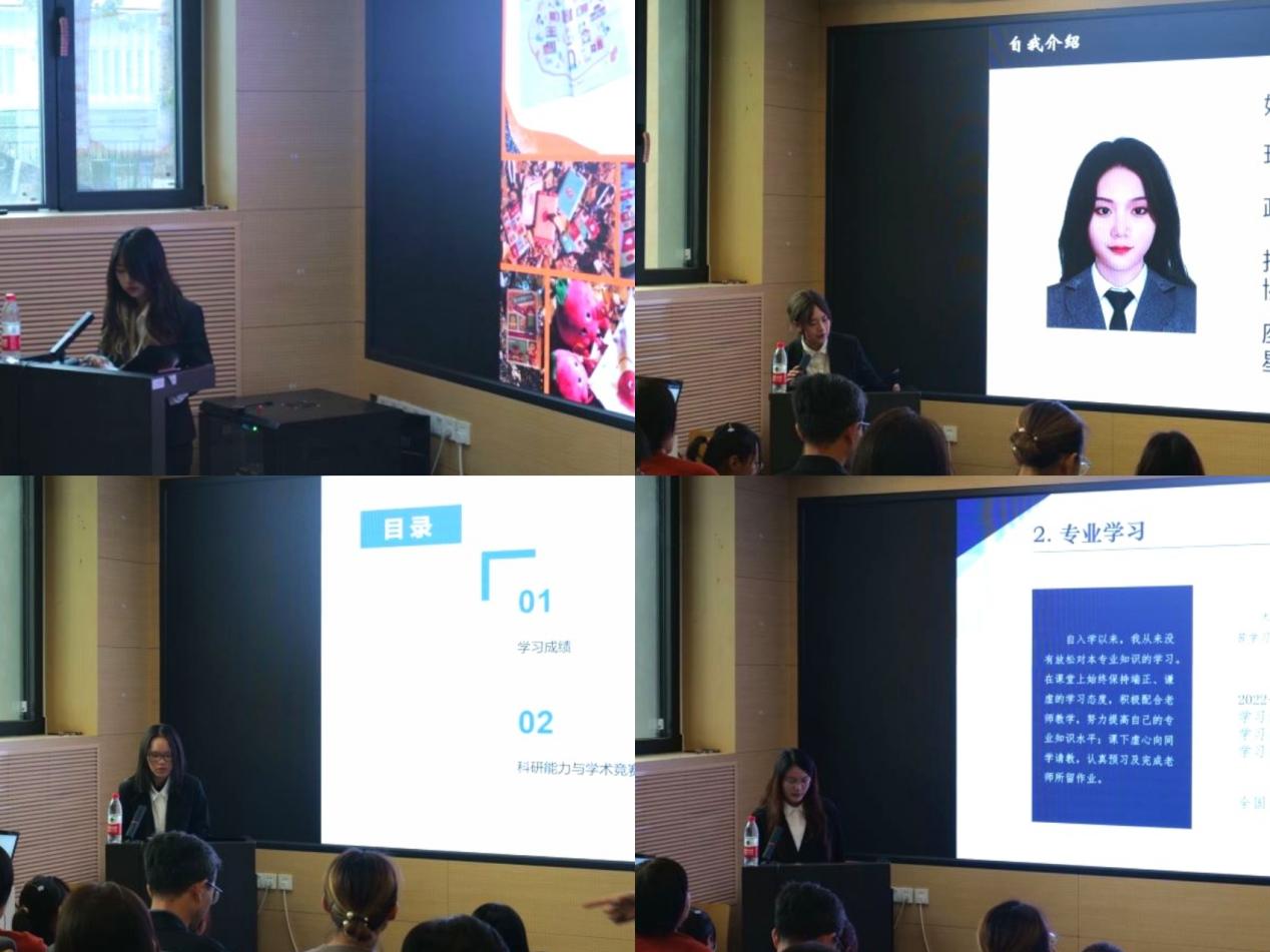 过前期组成专项奖学金评审委员会、制定评选办法、学生申报、资格审查等环节,最终共22名同学入围国家奖学金和智瑾专项奖学金答辩,18名同学入围国家励志奖学金答辩。在答辩中,同学们分别围绕上一学年学术竞赛与科研、社会实践与志愿服务(社会服务与自强事迹)、个人综合素质等方面的表现进行了4分钟的自我展示。