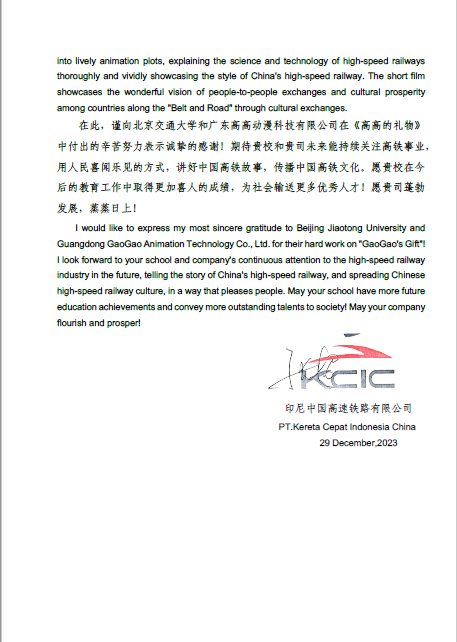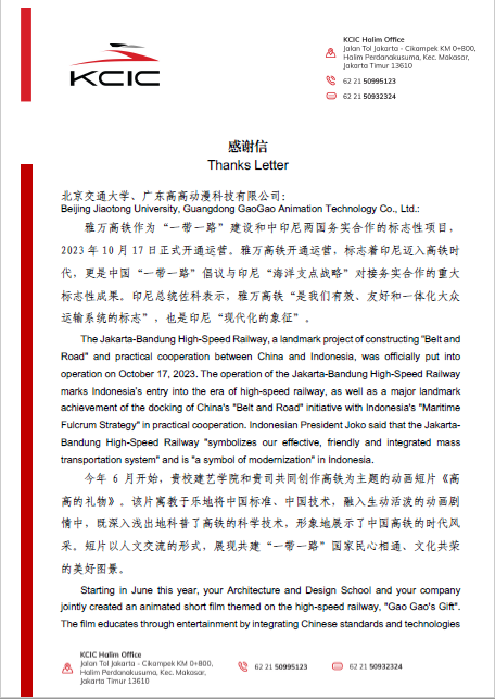 近日,学校收到来自印尼中国高速铁路有限公司的感谢信,对性吧与校企合作单位以雅万高铁为主题共同创作的动画片《高高的礼物》给予高度评价和诚挚感谢!