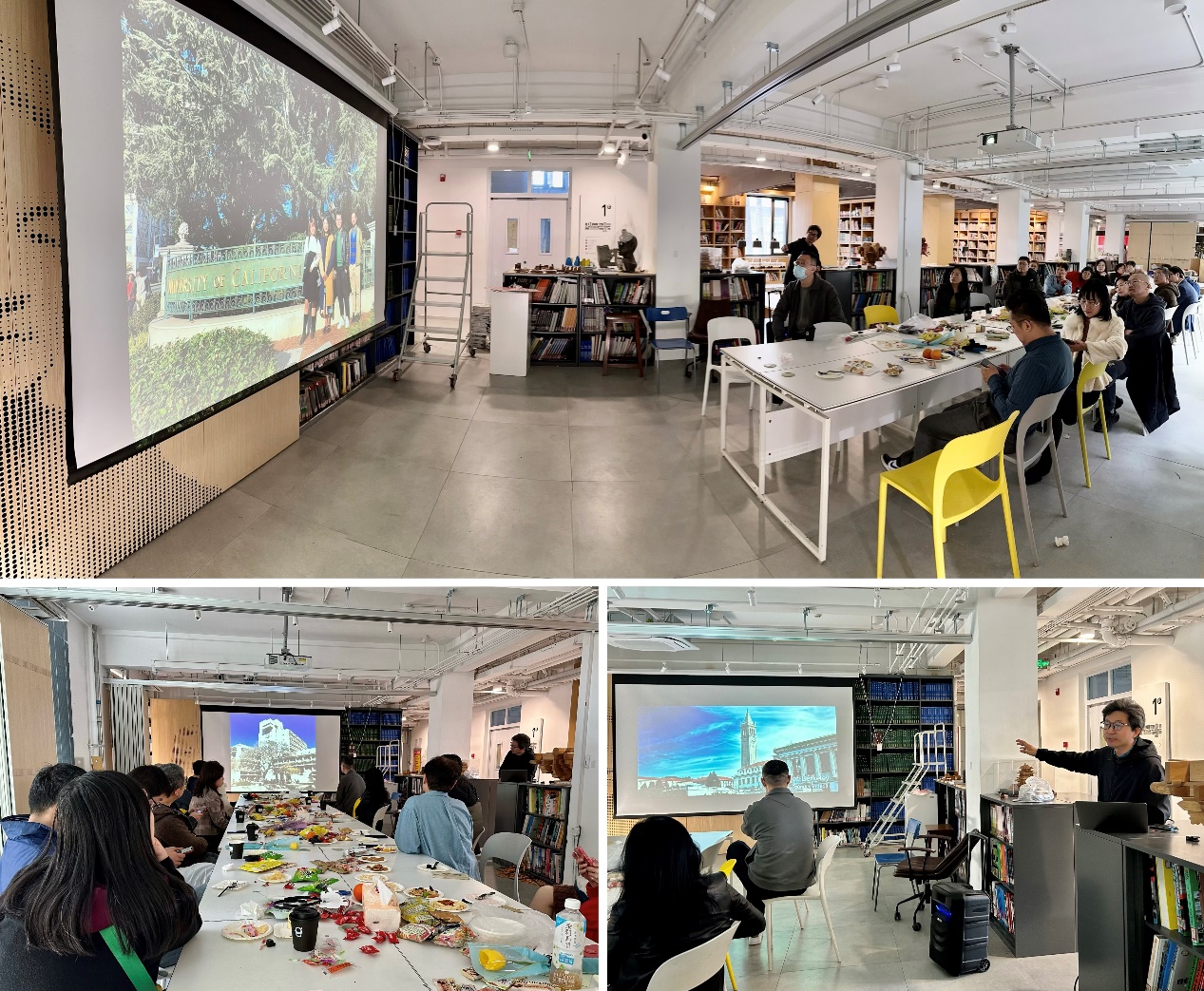 其乐融融的生日会后,学院青年教师联谊会组织“青芯”学术沙龙第6期,建筑系曾忠忠老师分享了在加州大学伯克利分校和辛辛那提大学的两段访问经历。他重点比较分析了伯克利的教学体系和辛辛那提未来实验室,为青年教师的学术生涯提供建议和思考。
