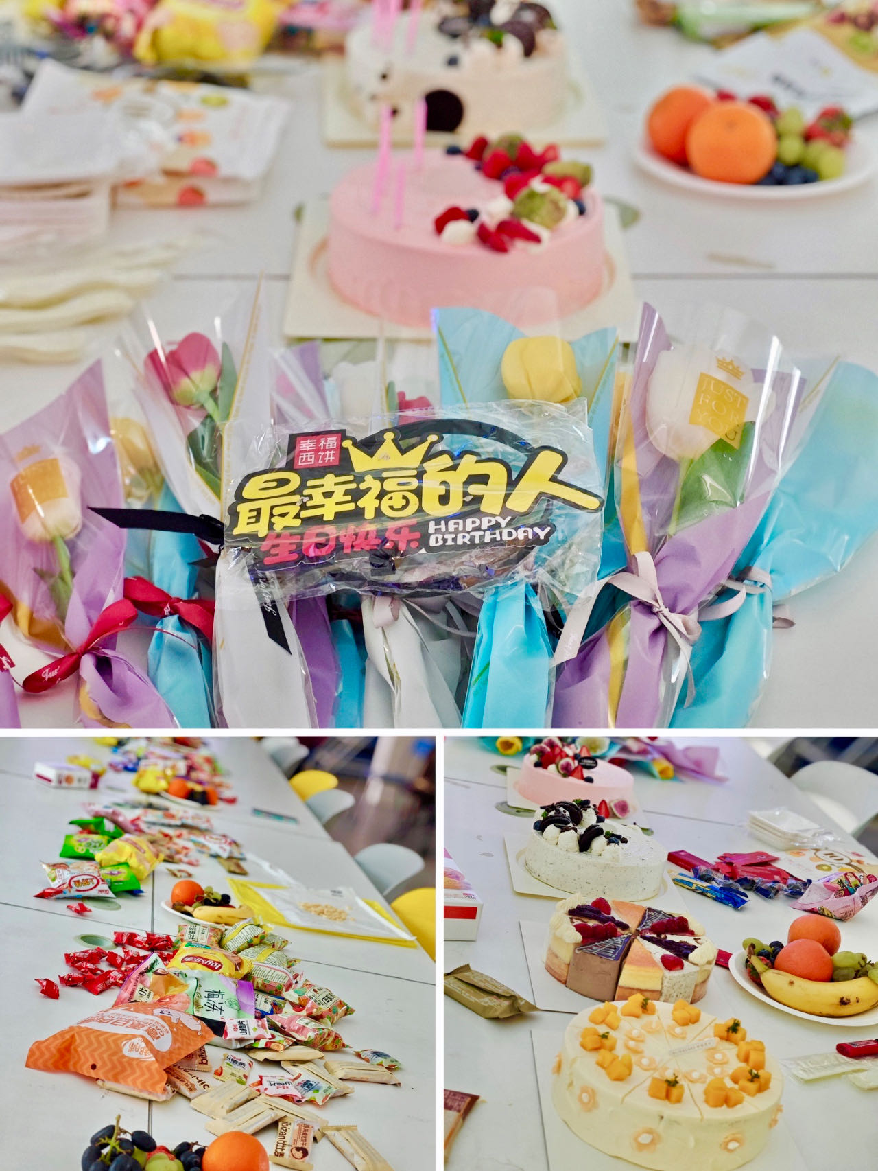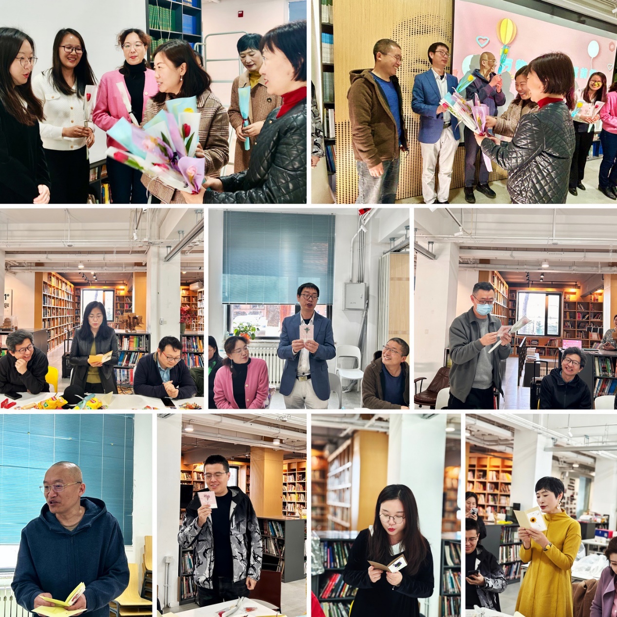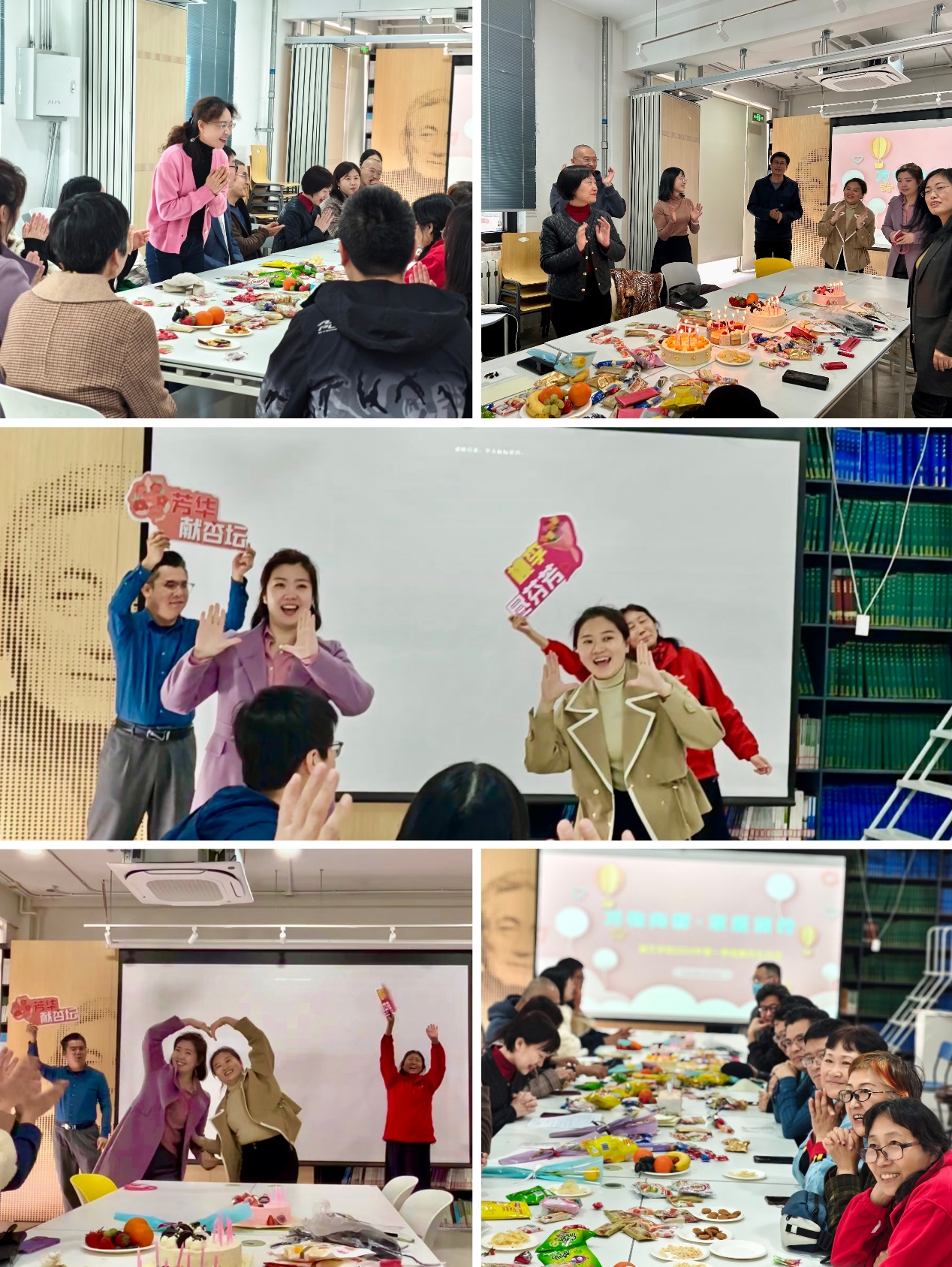 党委书记秦思阳为各位老师送上鲜花和生日祝福。活动现场伴随着欢快的《生日祝福歌》,张京和李萌两位青年教师带动老师们一起用轻快的舞步将喜悦的气氛推向顶点。随后过生日的老师与教职工们一同分享美味的蛋糕,共度欢乐时光。老师们在轻松的交流中增进了友谊,学院团结凝聚的“家”文化氛围愈加浓厚。