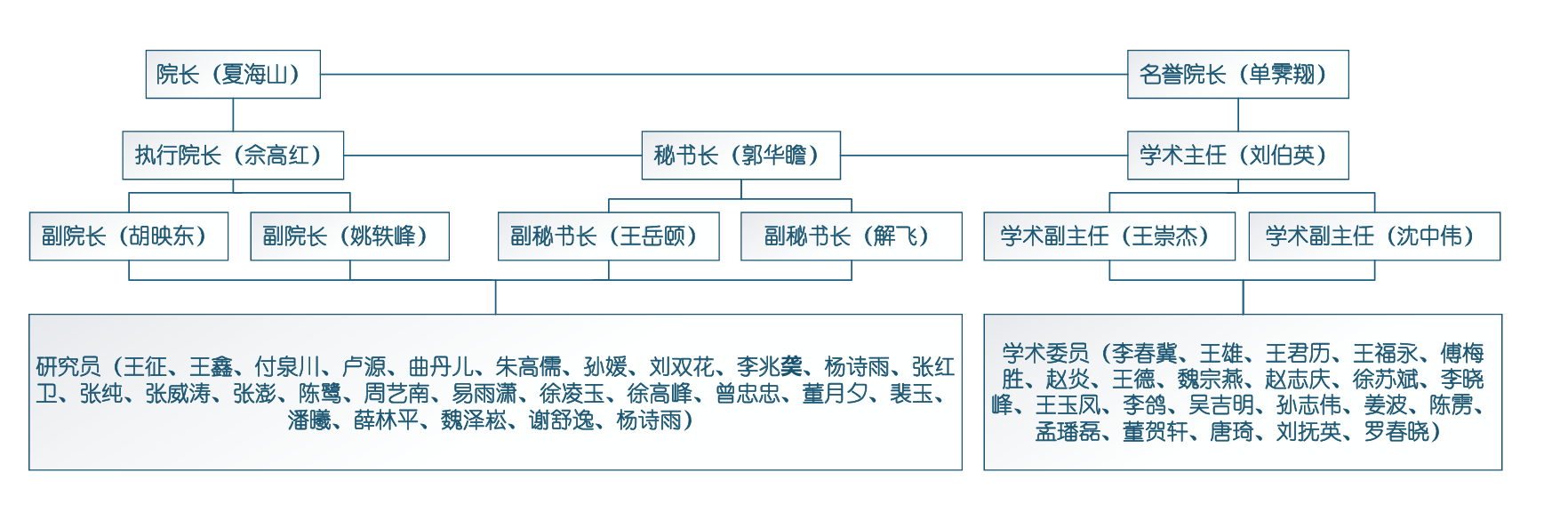 北京交通大学交通文化及遗产保护研究院挂靠性吧 管理,夏海山担任院长,单霁翔任名誉院长,刘伯英、王崇杰、沈中伟等任学术主任和副主任,现有研究成员31人,学术委员22人。组织架构如下: